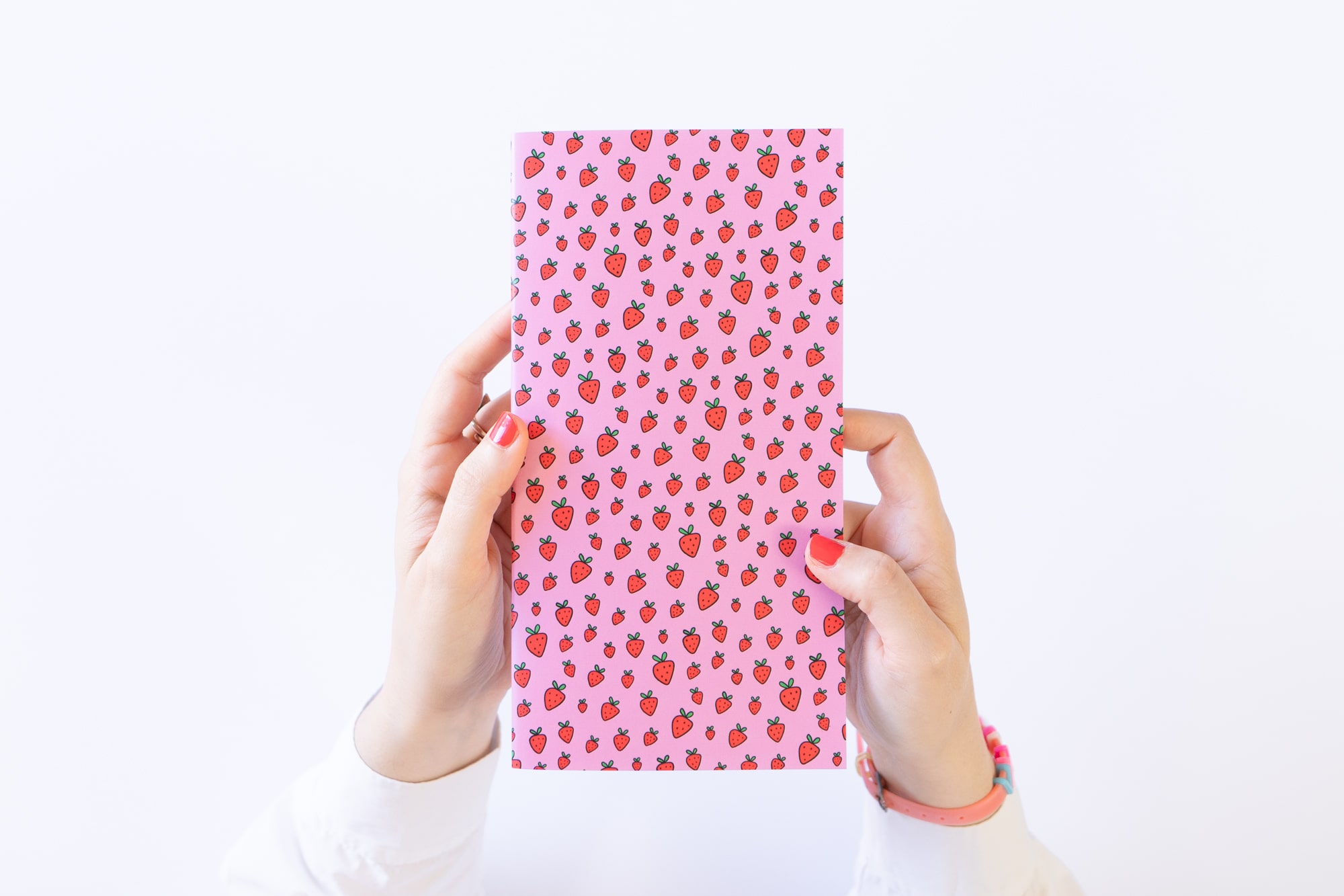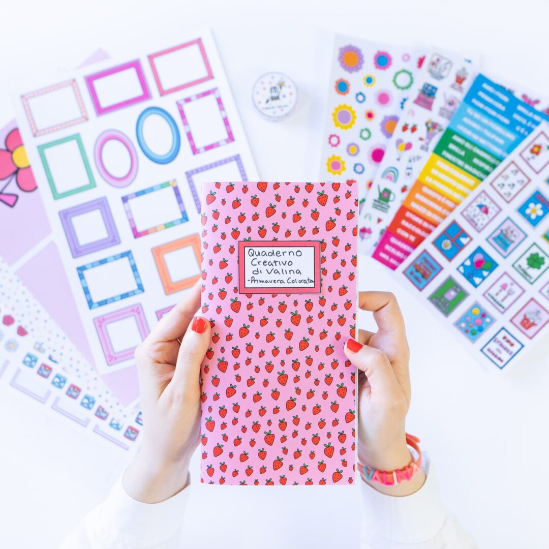 In più riceverai a il Quaderno fragoline, 4 fogli di sticker primaverili e il washi tape festa floreale .