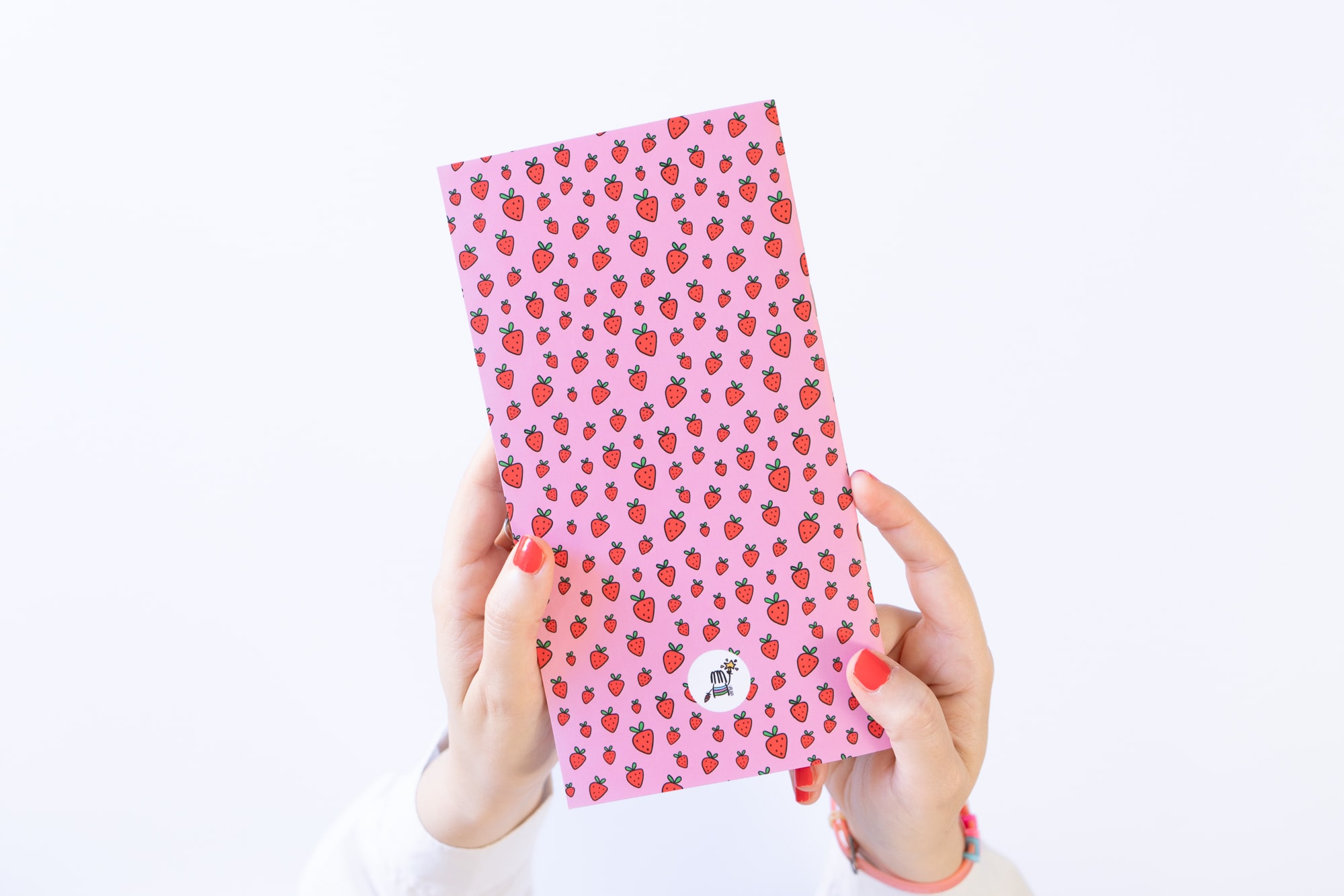 In più riceverai a il Quaderno fragoline, 4 fogli di sticker primaverili e il washi tape festa floreale .